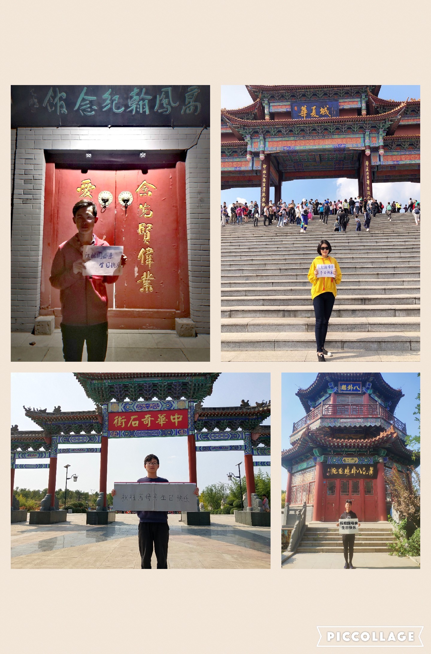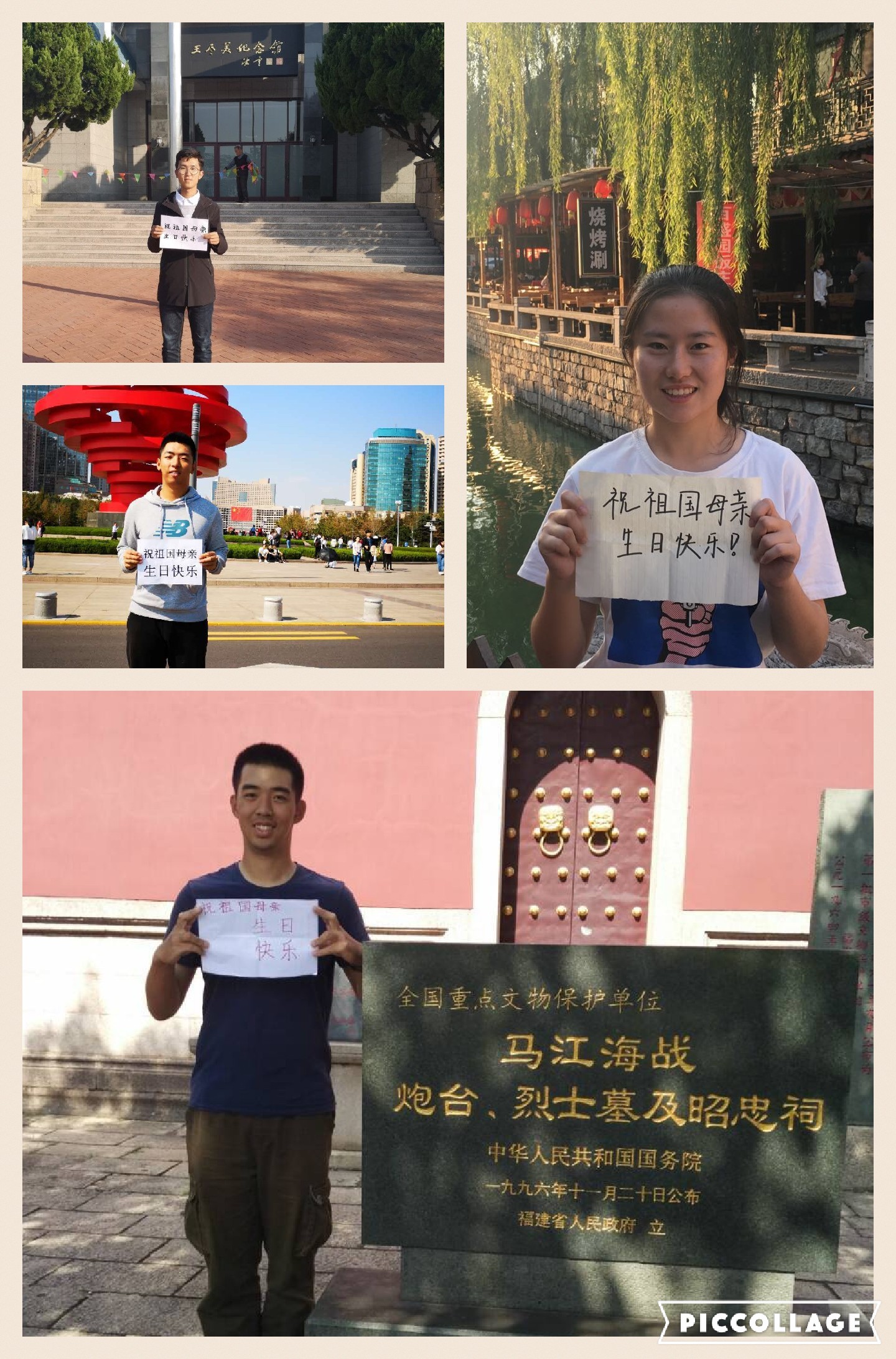 国庆期间,土木学子把对祖国母亲的祝福通过合影的形式记录下来。土木学子们手持祝福的字条与祖国母亲的壮丽河山、古老文物和建筑、时代发展的新标志、新气象合影,一张张土木学子的笑脸里蕴含着对祖国母亲最深切的祝福,学院也通过微信公众号及时将学子对祖国母亲的祝福展示。