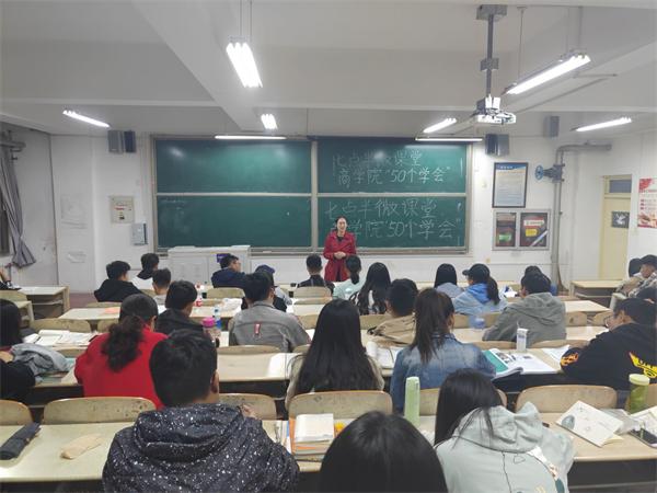 为加强商学院新生入学教育,培养良好学风,商学院于10月22日晚在长江路校区二号教学楼以班级为单位举办“七点半微课堂”第一讲——商学院“50个学会”,2018级辅导员宋颖、杨洪敏及商学院2018级学生参加。