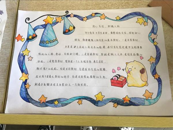 此次活动通过线上线下两种途径进行宣传,要求参加者以“用心交往,和谐人际”为主题,制作创意手抄报,作品内容涵盖题目、插图和文字三个部分;各部分内容体现心理健康方面知识,积极向上,突出主题,具有知识性、趣味性和可读性;插图部分要具有心理教育和心灵启发作用,并要以手绘得形式完成。此次活动共收到135份作品,共评出夏嘉一、刘慧君两名同学为一等奖,关露等三名同学为二等奖,范开戈等三名同学为三等奖。