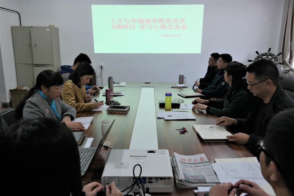 为了深入宣传贯彻习近平新时代中国特色社会主义思想和党的十九大精神,坚持共产党人“不忘初心、牢记使命”的执着信念,彰显共产党人“信仰坚定、心系群众、勇于担当、创新奉献”的精神风貌,在让全体党员在规定的时间内观看《榜样3》的同时,11月20日下午,人文与外国语学院总支书王新、副书记王振及部分教师党员在长江路校区一教504会议室召开人文与外国语学院党总支《榜样3》心得体会交流会。