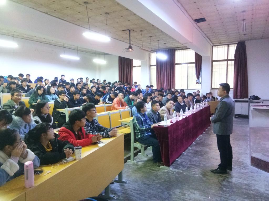 挑战杯宣讲会环节,科技创新优秀教师刘文锋教授对“挑战杯”做了详细的介绍,“挑战杯”大学生课外学术科技作品竞赛是由共青团中央、中国科协、教育部和全国学联共同主办的全国性的大学生课外学术实践竞赛,是我国大学生课外科技创新活动中具有导向性、示范性和群众性的最高赛事,也是各高校展示科研成果和办学水平的一个重要途径。刘老师分享了他十多年来指导学生们做大学生科技创新项目的经历、感悟,鼓励同学们勇于尝试,积极进取,争取做出好的成绩。科技创新优秀学生周正分享了自己的比赛经验。周正结合PPT从目的与出发点、项目与团队、坚持与协作、材料与汇报四个方面详细介绍了自己大学四年的参赛过程,使同学们更加深入的了解科技创新创业类比赛。