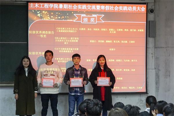 大会伊始,马蓉蓉表示社会实践是大学生接触社会、了解国情、增长才干、磨炼意志的有效方式,是加强和改进大学生思想政治教育工作的重要途径。杜诗琳对学院2018年暑期“三下乡”社会实践进行了全面总结并为学院暑期优秀调查报告团队颁奖。随后,获得优秀团队的队伍进行成果经验交流,获奖队伍表示在实践过程中,广大同学应心系民族命运、国家发展和人民福祉,自觉担当、奋勇向前,以强烈的爱国热情、高度的社会责任感和崇高的奉献精神,向社会展示了理工学子“百折不挠、刚毅厚重、勇承重载”的精神风貌和良好形象。最后,志愿服务协会负责人进行了寒假社会实践的动员,强调了寒假社会实践的作用和要求,让同学们意识到寒假社会实践的必要性。