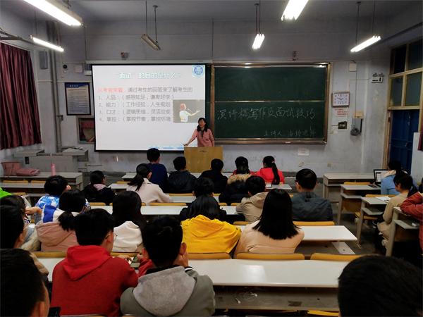 讲座伊始,潘玲现场教学,根据同学们现场演讲和答辩所表现出来的问题给予了纠正点评,并且就面试时穿着、仪态、语言等方面的细节进行了规范。随后,潘玲提出面试时起、承、转、合的四种方法。她从不同的视角来分析,以不同人面试时候的表现为例,介绍应该如何正确定义面试;潘玲结合自己当面试官的经验,分析面试时紧张的原因,并现场与同学们互动,分享了一些面试技巧。最后,潘玲为同学们作演讲稿写作的培训,她运用丰富的素材以及讲述许多真实的案例让同学们获益匪浅。整个讲座过程气氛活跃,同学们认真记录,积极参与互动交流。