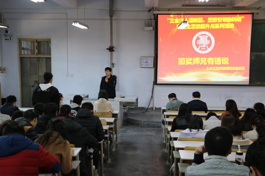 11月22日,土木工程学院组织2018年研究生国家奖学金的获得者郏书朔(钢结构方向)、匡政(岩土方向)和王明明(岩土方向)3位2016级研究生在一教200阶开展了“国奖师兄有话说”系列讲座,为研究生新生分享学习心得、科研方法和职业规划等相关经验。此次讲座是学院开展“三全育人谱新篇,思想引领助科研”研究生思想提升月系列活动之一。