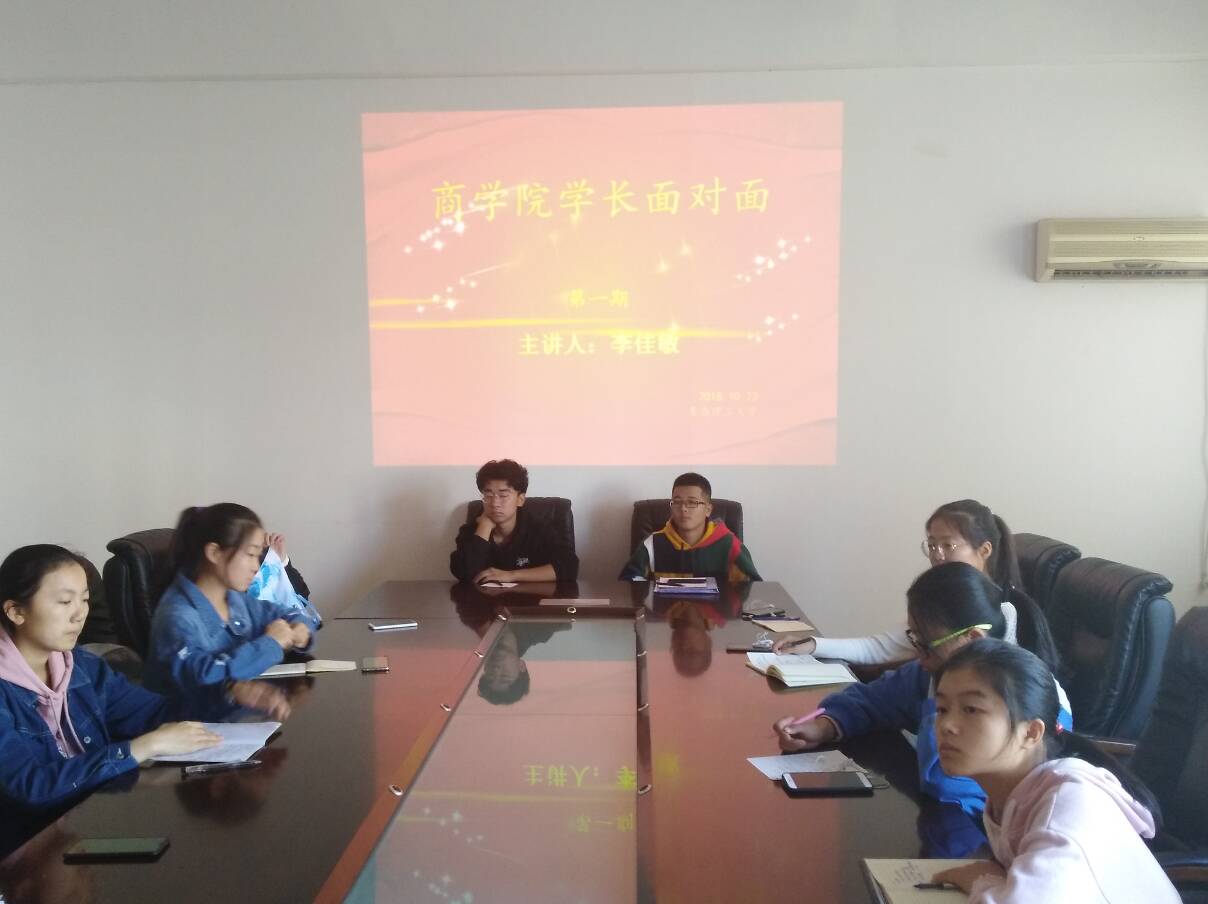 近日,商学院于长江路校区一教318室举办“学长面对面”交流活动,本次活动由国家奖学金获得者、山东省优秀学生李佳敏同学主讲,商学院20名学生参加。