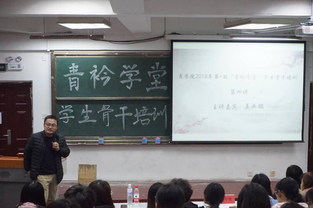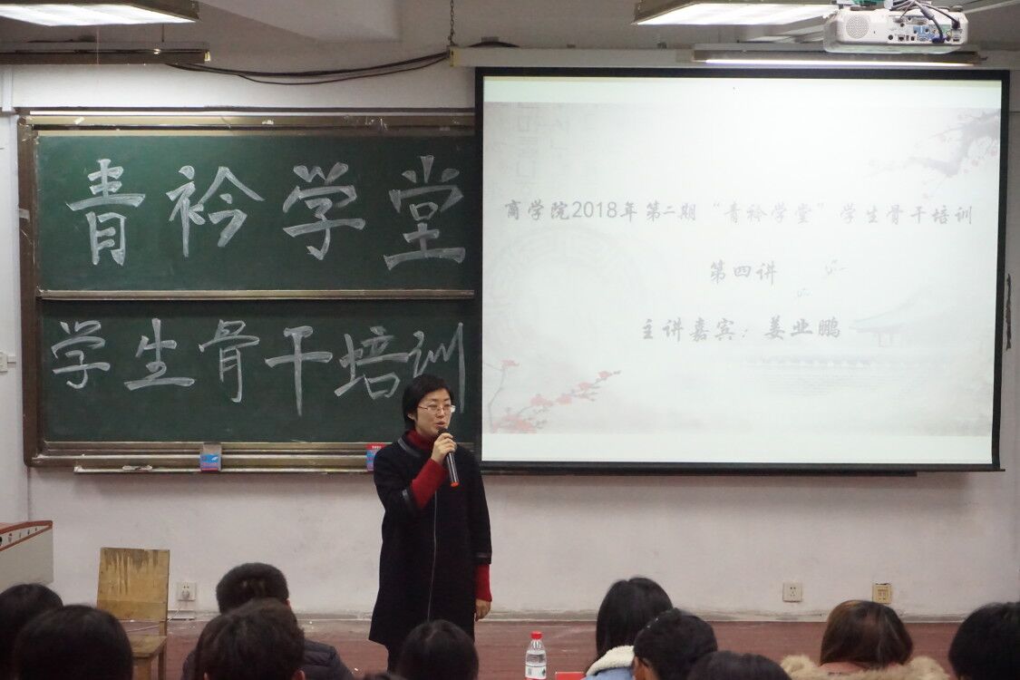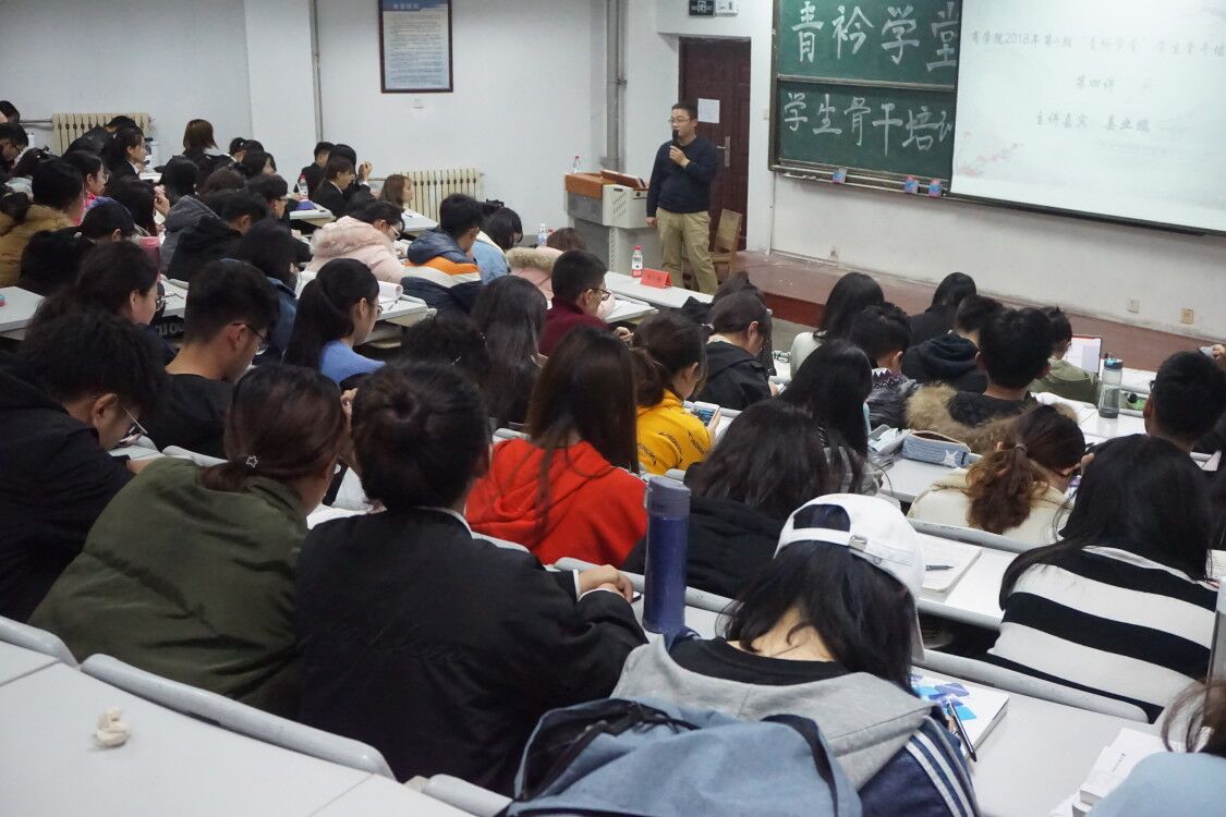 11月28日下午,商学院在长江路校区2号教学楼阶204举办2018年第二季第四期“青衿学堂”学生骨干培训,青岛理工大学09届优秀校友姜业鹏做主题报告,辅导员林丰艳主持,商学院主要学生干部共160余人参加培训。
