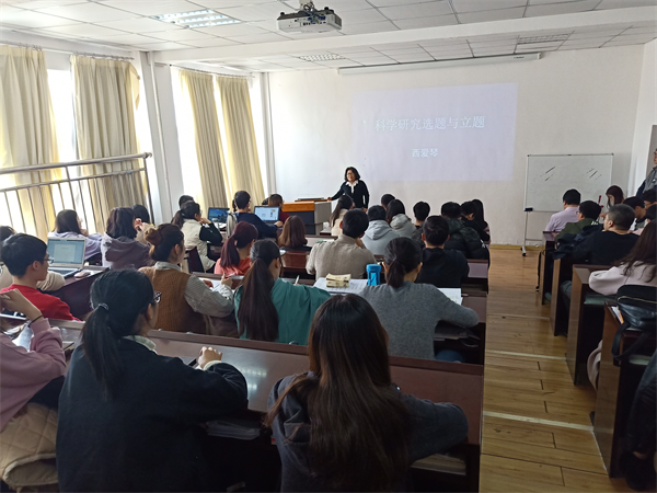 西爱琴认为,论文写作是每位研究生的必须训练,扬帆起航所需的基本能力和续航的加速动力。首先,西爱琴提出硕士研究生应具备培养问题意识与问题凝练的能力,通过现实学术问题探究,基于问题导向进行科学选题。其次,西爱琴向同学们介绍了选题的原则,并强调这是学术论文写作的关键一步。西爱琴对选题过程与方法进行了阐述,结合案例对选题误区与禁忌以及标题类型与命名进行了讲解,重点推荐了文献研究的经典检索网站。最后,西爱琴同在场师生进行了互动交流,启发在场每位硕士研究生对科学选题与立题的深入思考,现场互动气氛热烈。