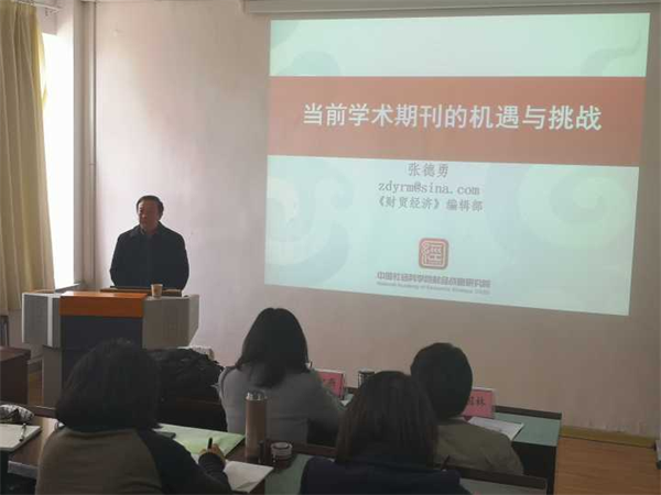 张德勇首先从学术影响力视角出发,对学术期刊的重要载体作用做出详细解读与说明,并指出中国的发展是学术期刊发展进步的重要保障。随后,张德勇以学术期刊发展为起点,结合我国现实情况,介绍了学术期刊发展中面临的机遇与挑战,就国内经济类期刊同质化现象严重、高校学术期刊影响力不断扩大等问题进行了详细解读,并提出《财贸经济》杂志编委会调整规范编辑流程、严格执行三审三校等一系列措施提高办刊水平。最后,张德勇同现场师生就投稿、主编审稿等问题进行了积极互动,现场气氛活跃。