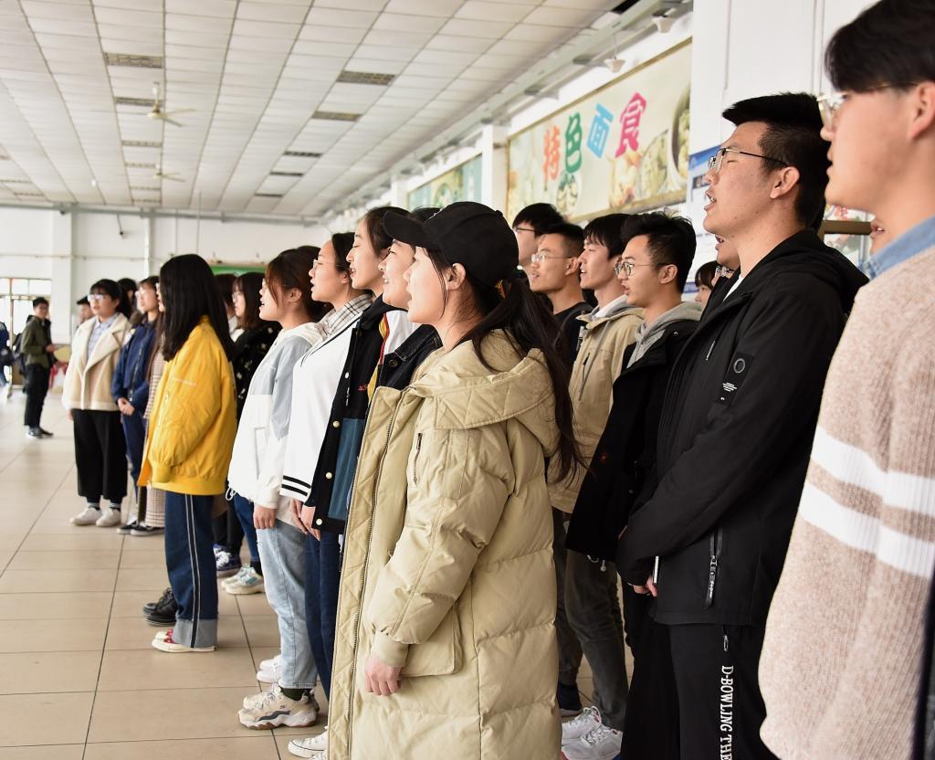 当天,熙熙攘攘的北院食堂与往日一样温馨,12:15,一阵悠扬的古筝伴奏声从食堂中央响起,演奏的正是大家耳熟能详的《我和我的祖国》旋律。主唱演员深情动人的歌声感染了现场观众,正在食堂用餐的师生纷纷被吸引,路过的同学都不由自主地放慢脚步,或拍照留影,或轻声跟唱,整个活动场面气氛和谐。