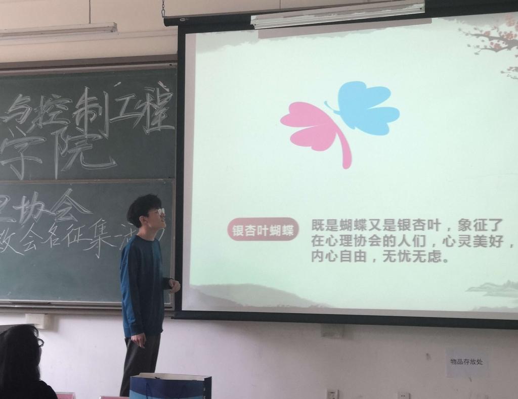 此次胜出的《舒怀·心理》会徽设计简洁大方,主题明确、形象美观,主体以开放式的圆形为基础,开放式象征了心理协会人心扉敞开的寓意。银杏叶象征幸福和健康,蝴蝶象征自由和美丽。上面银杏叶蝴蝶由银杏叶和蝴蝶组成,视觉上既是蝴蝶又是银杏叶,象征了在协会成员心灵美好,健康自由。中间以两个“心元素”为基础,整体变形成类似面对面交谈的造型,可理解为人与人真诚的心理对话。银杏叶蝴蝶与心造型融合体现出成员们阳光欢快活力,多个粉色和蓝色圆圈代表了在协会中的男女成员们。“舒怀”蕴含了协会对人的心理的尊重、理解、真诚和接纳,整体体现了协会的性质。