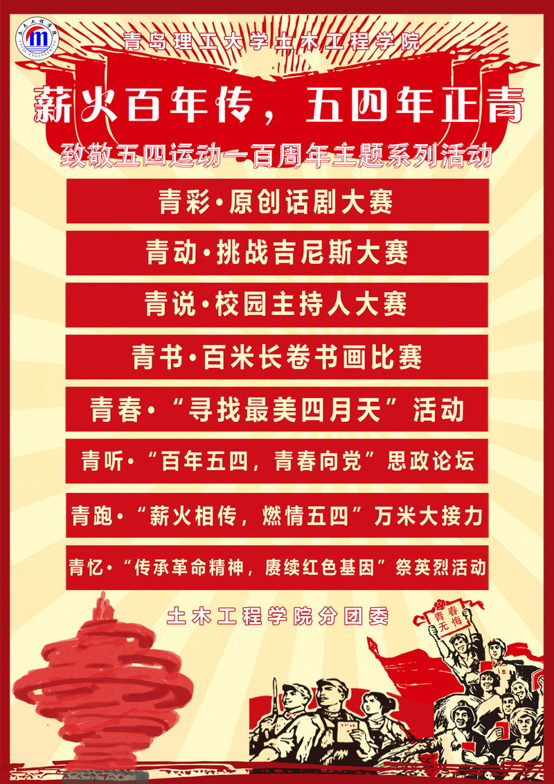 本次主题活动为期一个多月,旨在加深学生对五四运动的了解,自觉传承五四精神,培养爱国情怀,活动内容丰富,包含:“青彩·原创话剧大赛”、“青动·挑战吉尼斯大赛”、“青书·百米长卷书画大赛”、“青听·百年五四,青春向党思政论坛”等活动,将引导学生对五四运动和五四精神深入了解和认识,通过系列主题活动展现学生追梦奋斗的家国情怀和昂扬向上的青春风采,激励土木学子奋发图强,坚定青春心向党,励志建功新时代。(撰稿:王中帅 审核:邵先锋)