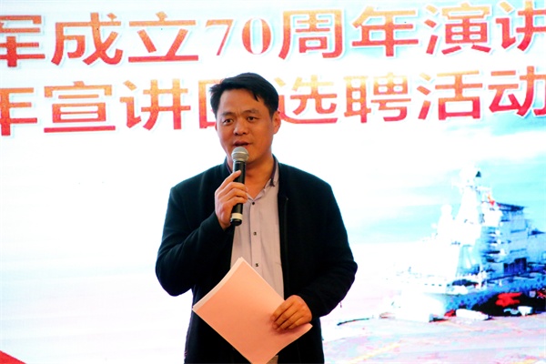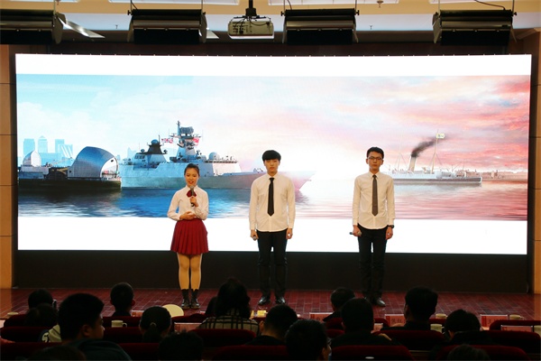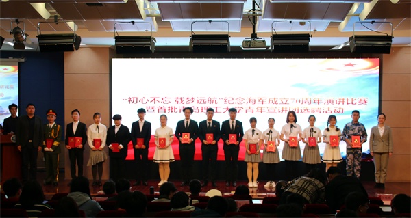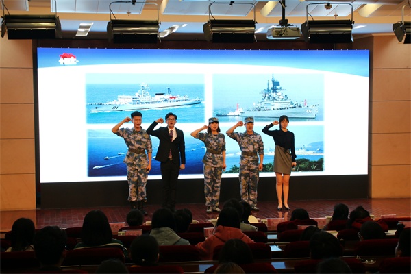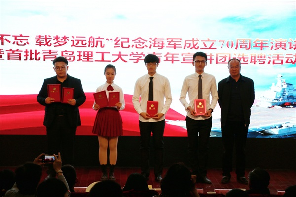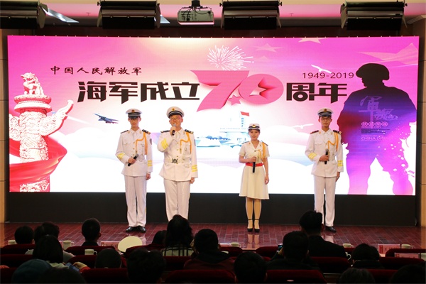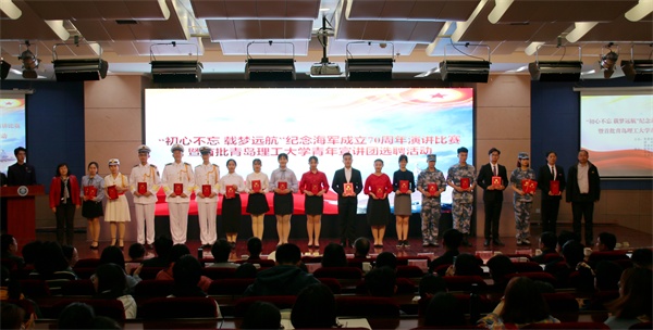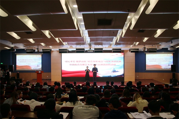 中国人民解放军海军成立70周年纪念日之际,4月17日下午,我校在报告厅举行“初心不忘 载梦远航”纪念海军成立70周年演讲比赛。党委常委、副校长沈文青,党委常委、党委宣传部部长陈伟,学生处、团委、武装部等部门负责人出席活动,各学院党总支负责人、分团委书记和辅导员老师及280余名师生共同观看了比赛。全军十大主持人王雷、青岛广播电台资深播音员李雁、山东省演讲学会常务理事潘玲等业界知名专家应邀担任比赛评委。