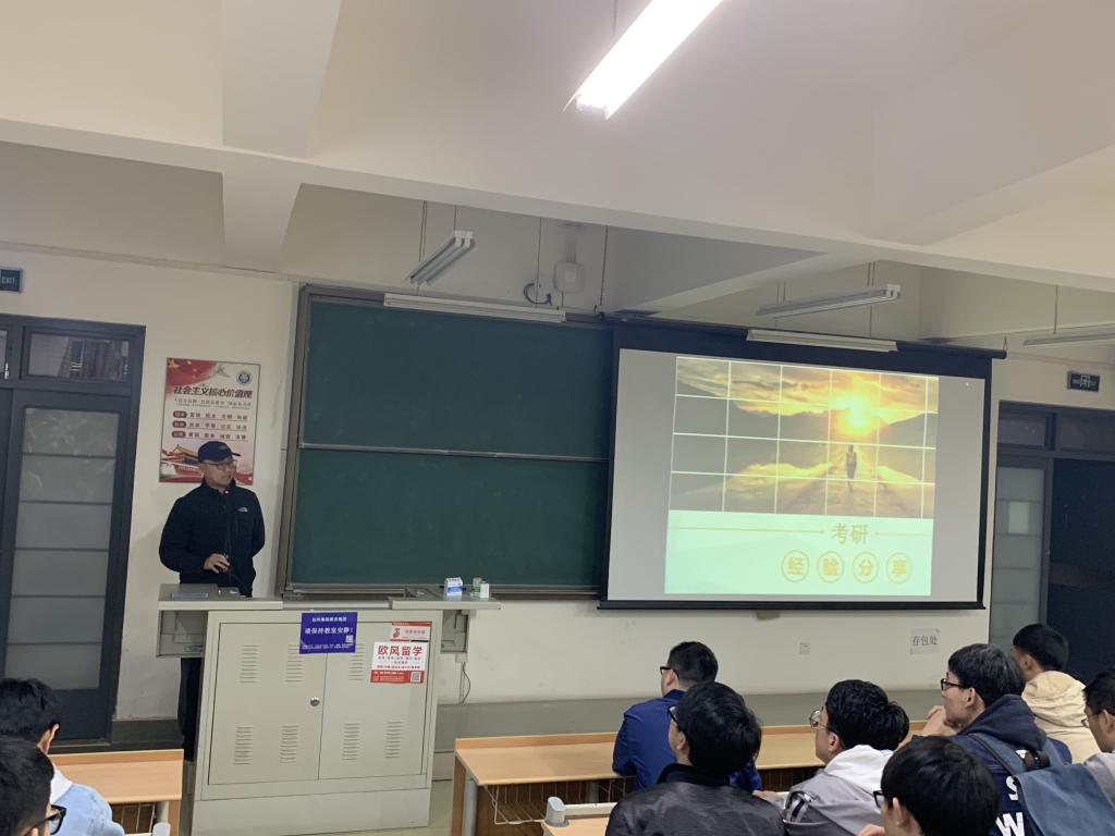 以374分被东华大学录取的耿君先同学,重点交流了他的考研心路,介绍了考研过程中遇到的一些问题及注意事项;考取哈工大的李傲同学以自己的亲身经历告诉大家不要过于担心自己的短板,只要有坚定的毅力和必胜的信心,一定会在考研复试中成功逆袭;考取合肥工业大学的魏兆阳同学,英语获得了83分的优异成绩,他着重介绍了在英语学习方面的学习经验;考取重庆大学的肖永睿同学谈到,考研一定要做到求知若饥、虚心若愚,一定要通过主动虚心请教;考取哈尔滨工程大学的张睿同学谈到,要注重对平时学习过程的反思总结。勤于总结、善于思考,是他成功的真谛;考取山东大学的王金水同学认为考研就是要心无旁骛专心致志,只要肯下功夫,一定会取得自己满意的成绩,他结合考研的一些时间节点详细地向同学们做了介绍;考取东北大学的王德新与张楚同学,强调了考研过程中劳逸结合的重要性,考研是一个长期的过程,要时刻保持自己的学习状态,要养成良好的作息及锻炼身体的习惯,不要让自己过于劳累导致效率低下。