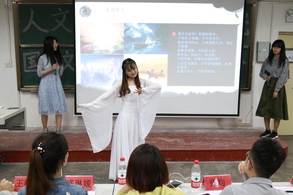 本次比赛共有9个队伍,各参赛队伍按照抽签顺序依次上场展示。活动过程中,选手们主要通过小讲堂形式辅之歌舞、小剧场等特色表演将国学知识绘声绘色的表现出来。《古人的生活》从衣食住行四个方面描述了古代的生活;《国学文化宣讲》和《水调歌头》两队分别用不同的形式介绍了大词人苏轼的作品,详细介绍了国学文化演变过程;《水调歌头》以歌舞、朗诵的形式进行了立体化的表演;《春秋背景下诗经背后的故事》讲述了诗经故事中春秋时代的纠葛;《中国古代的名人广告》通过新颖的现代传媒角度讲述古代的“名人效应”;《国学精典文化》详细讲解了“国学”的概念;《笔墨丹青》为我们展示书法和国画并分享了绘画技巧;《急急如律令》普及了律令的不同含义,讲述了道家特色文化;《篆刻》带我们领略了篆刻的魅力。选手们精彩绝伦的表现赢得评委和在场观众阵阵掌声。经过激烈的角逐,《笔墨丹青》荣获一等奖,《篆刻》荣获二等奖,《春秋背景下诗经背后的故事》和《急急如律令》荣获三等奖,《国学文化宣讲》获得优秀奖。