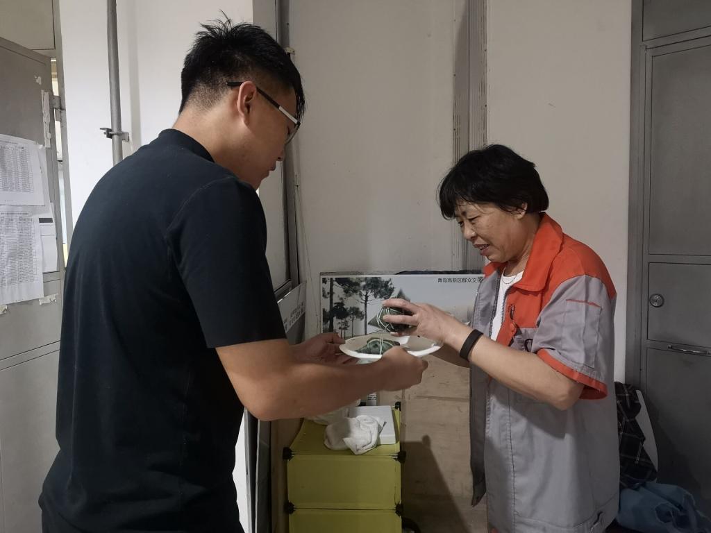 6月6日清晨,在弥漫着浓浓粽叶香味三楼中厅中,同学们开始了行动。有的同学曾经包过粽子,对这种小活信手拈来;有的同学第一次尝试包粽子,在其他同学的指导下,也包得很好。王明慧也与同学们一起动手包粽子,过程中跟同学们交流端午节的由来,师生有说有笑,其乐融融。同学们把煮好的粽子首先送给了门卫阿姨和保洁阿姨,请她们一起分享这“美味”的时光。黄丹同学有感而发,她说:“虽然端午节没能回家,但这次活动让她体会到了家的味道,跟同学们在一起非常开心”。韩忠宇同学说:“通过这次活动我学会了包粽子,看着自己包的粽子成型、煮熟,非常有成就感”。
