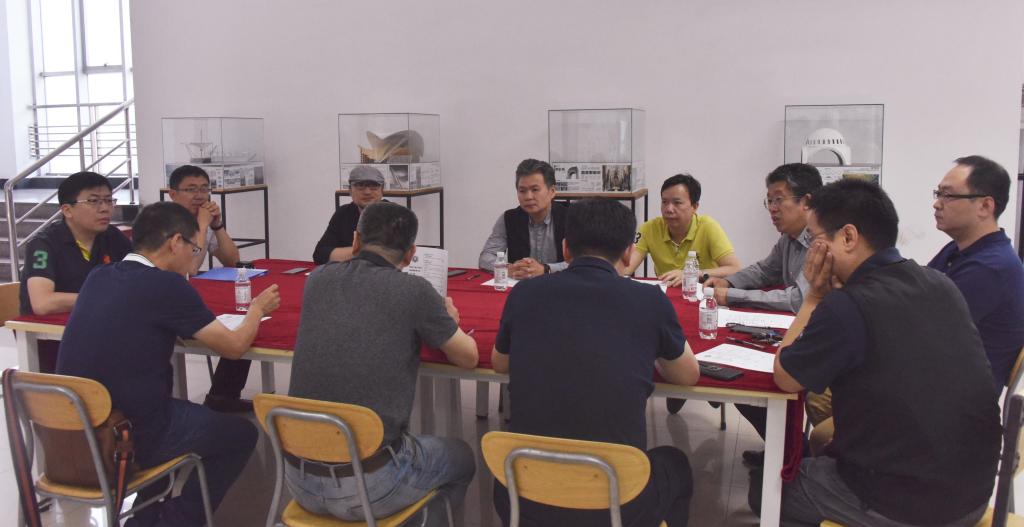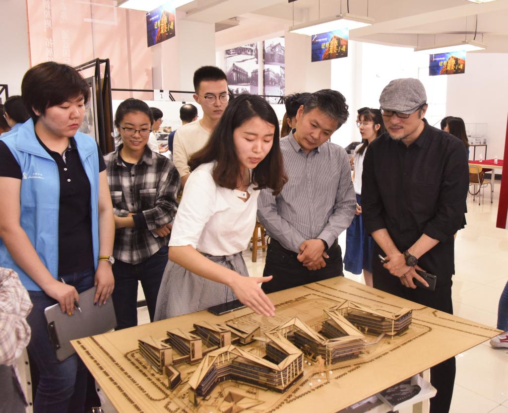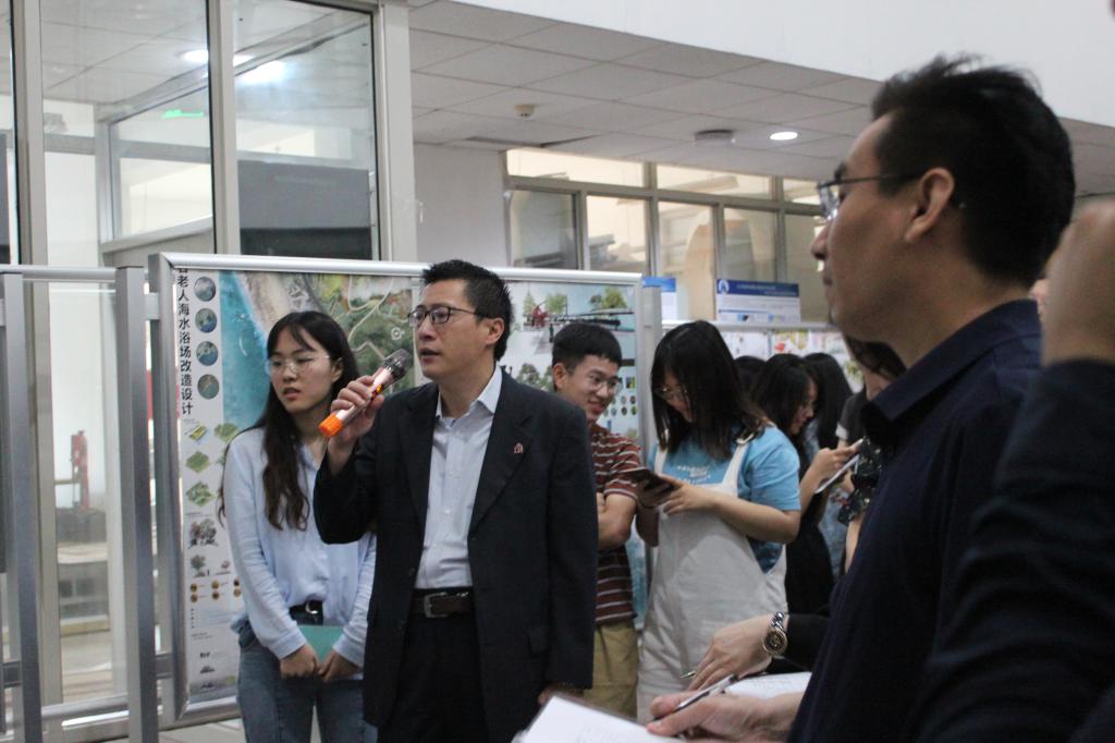 在二楼的建筑学专场,展评邀请了青岛北洋建筑设计有限公司总经理郝彤、青岛腾远设计事务所有限公司总建筑师王震铭、北京中环世纪工程设计有限公司青岛分公司总经理赵军、青岛国立设计有限公司副院长徐瑾东、青岛理想城市建筑设计有限公司总建筑师绳兵、DC·HD国际设计有限公司青岛中房建筑设计院有限公司院长刘刚担任评委,建筑与城乡规划学院党总支书记肖学斌、副院长朱一荣、党总支副书记高江、建筑系主任王少飞等出席展评。