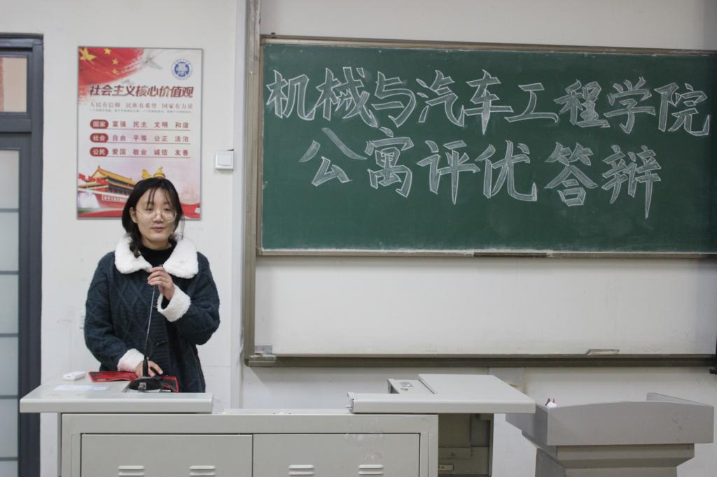为进一步贯彻落实“六JING一警”公寓文化理念,发挥学生公寓平台的育人作用,讲述公寓故事,传递公寓声音,营造良好的育人氛围,增强大学生的集体荣誉感和团队意识,机械与汽车工程学院于11月21日下午在嘉陵江路校区主教学楼B132举办2019年度公寓评优答辩大会。辅导员张翠芳、殷宗华、徐卫晓、吴静担任答辩评委,答辩宿舍全体成员及2018级、2019级部分学生代表参加。
