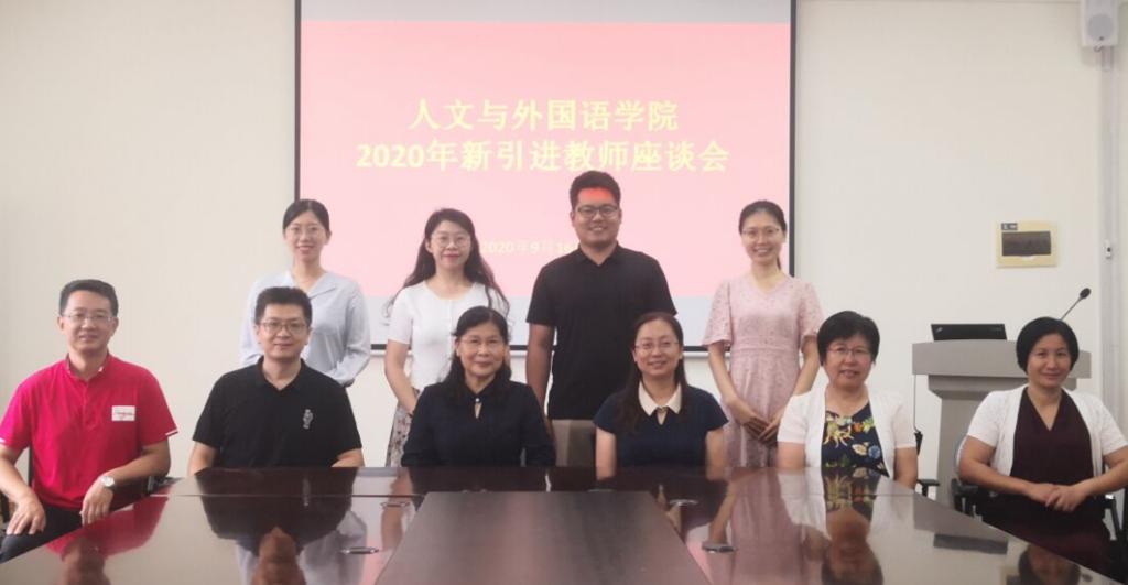9月16日下午,人文与外国语学院在嘉陵江路校区教学楼A410会议室举行2020年新引进教师座谈会,党总支书记王新、院长巩湘红、副院长王晓东、郭印、莫玉梅、院长助理冯志国和新引进教师亲切交流。