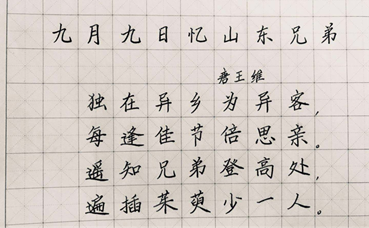 从古至今,重阳节都被认为是吉祥的节日,也正因为如此,许多表达向身边之人表达祝愿、思念之情的艺术作品不断涌现,口口相传,代代相承。财管196、财管204支部以书法的艺术形式,书写重阳诗词,重温历史韵味,有“独在异乡为异客,每逢佳节倍思亲”的思乡之情,也有“人生易老天难老,岁岁重阳。今又重阳,战地黄花分外香”的尺寸年华,同学们在笔尖上感受家乡的温暖,重温经典,推动弘扬中华优秀传统文化。