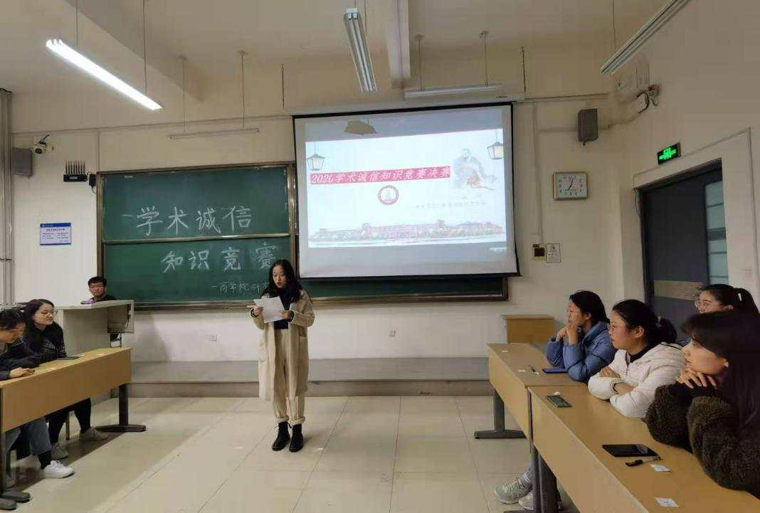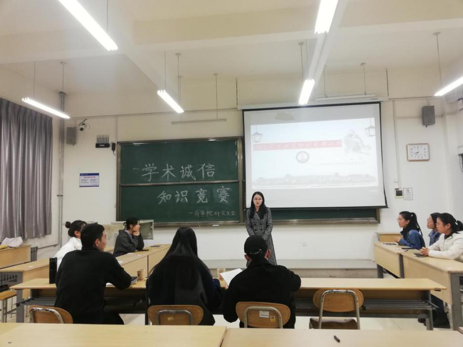 为弘扬学术正气,引导学生自觉遵守学术道德,11月20日晚,商学院研究生在主教学楼B116开展以“弘扬学术道德,坚守科研诚信”为主题的学术诚信知识竞赛决赛。商学院研究生会学生干部担任本次比赛的评委,学院研究生观摩比赛。