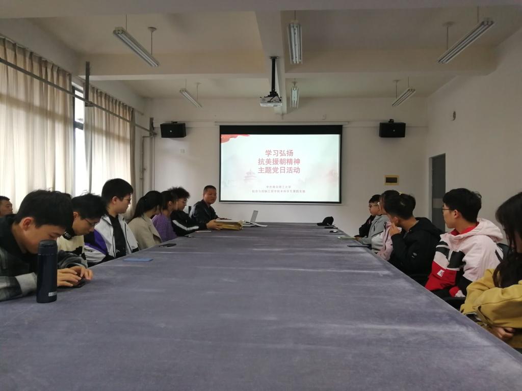 首先,王超同志介绍了学习抗美援朝精神的重要意义。然后,由组织委员季献涛同志带领大家学习《习近平:在纪念中国人民志愿军抗美援朝出国作战70周年大会上的讲话》,大家共同观看和学习了抗美援朝战争中的英雄事迹和战斗精神。接着,支部党员发表感悟,他们表示作为一名学生党员要坚定自己的理想信念,铭记历史,学习革命先烈英雄精神,不断奋进,尽自己最大的能力为祖国做贡献。最后由王超作总结发言,他希望各位党员同志能将伟大的“抗美援朝精神”转化为学习的动力,肯吃苦,肯担当,肯作为,争做模范先锋。