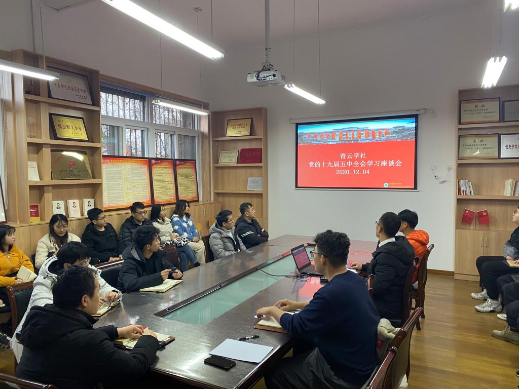 12月4日,环境与市政工程学院青云学社举行学习党的十九届五中全会座谈会,学院党总支副书记邵长飞参加,辅导员王登榜主持座谈会,学院思政类社团青云学社相关同学参加会议。