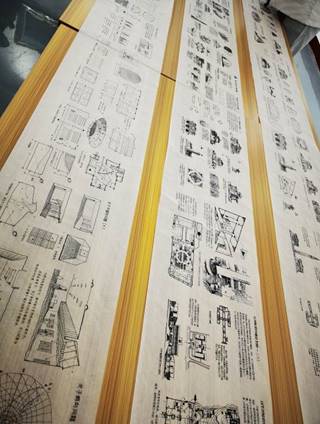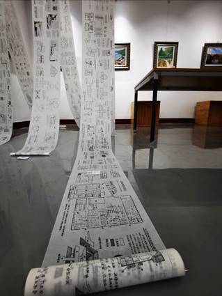 穿过展板区域就会看到展厅中心展位上一幅幅画卷似帷幔从展厅顶部延伸至地面,这是同学们在疫情期间完成的《建筑空间组合与构成》的课程作业。同学们在抗疫关键阶段没有停止学习,通过指导教师的在线课程指导,在家里独立完成了一幅幅五十米的“巨幅画卷”。