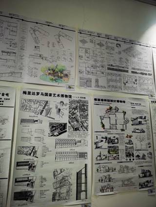 展厅南北墙壁上是《现代建筑思潮与作品赏析》课程作品展区。同学们将课上老师讲授的现代建筑发展历程与自己对现代建筑的理解,通过分析和抄绘后现代世界知名建筑大师的作品,深入了解建筑大师的设计思路与设计手法,积累了知识,开拓了眼界。